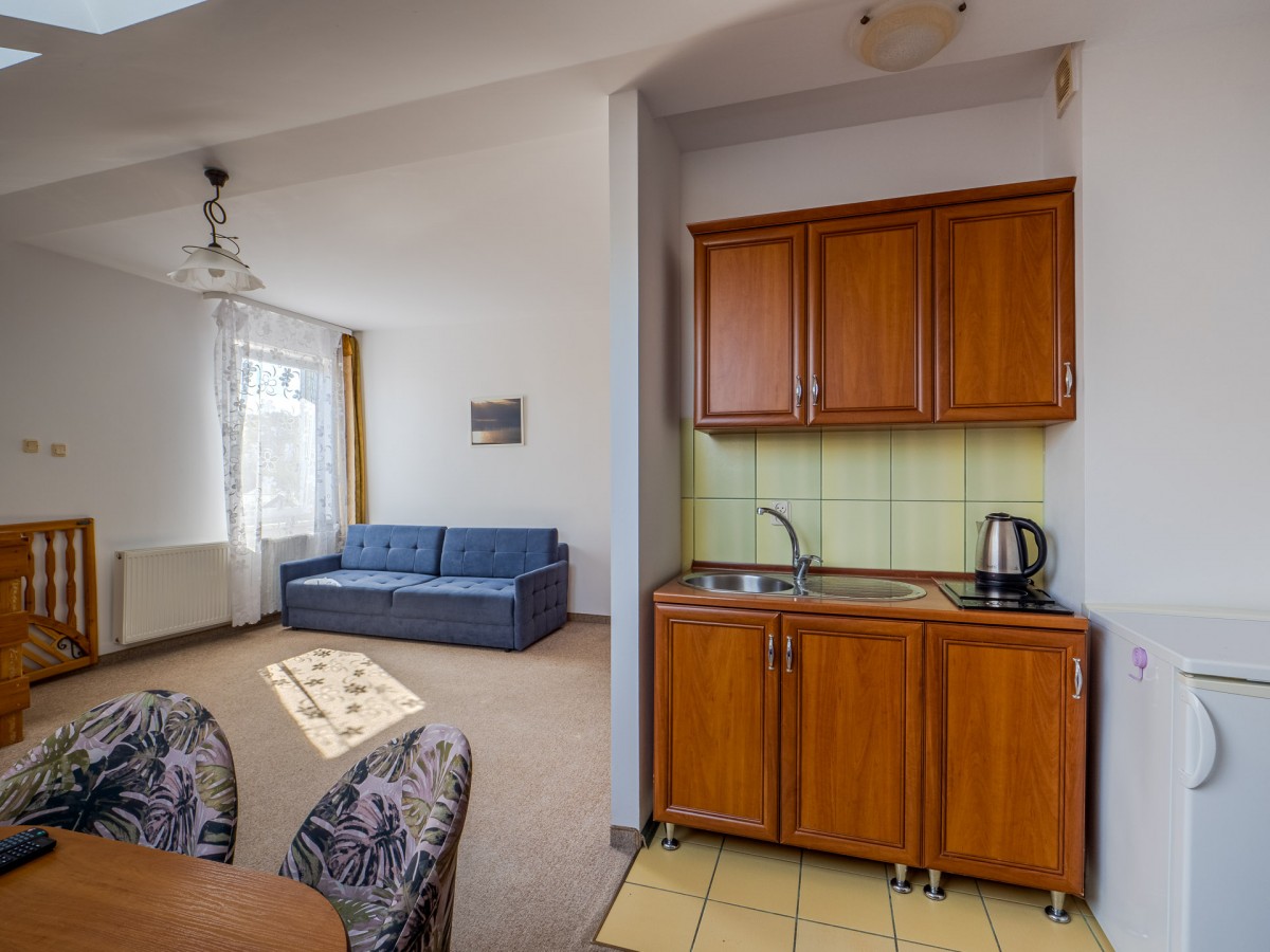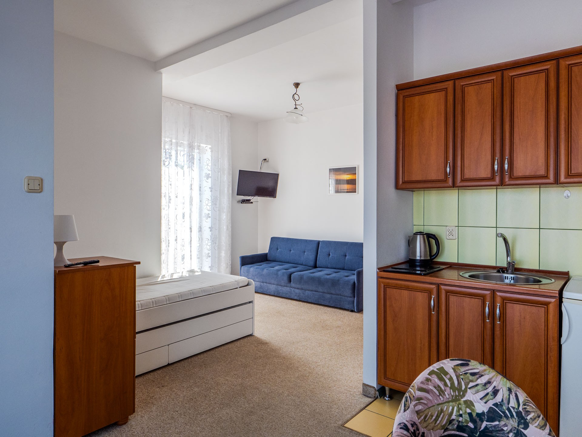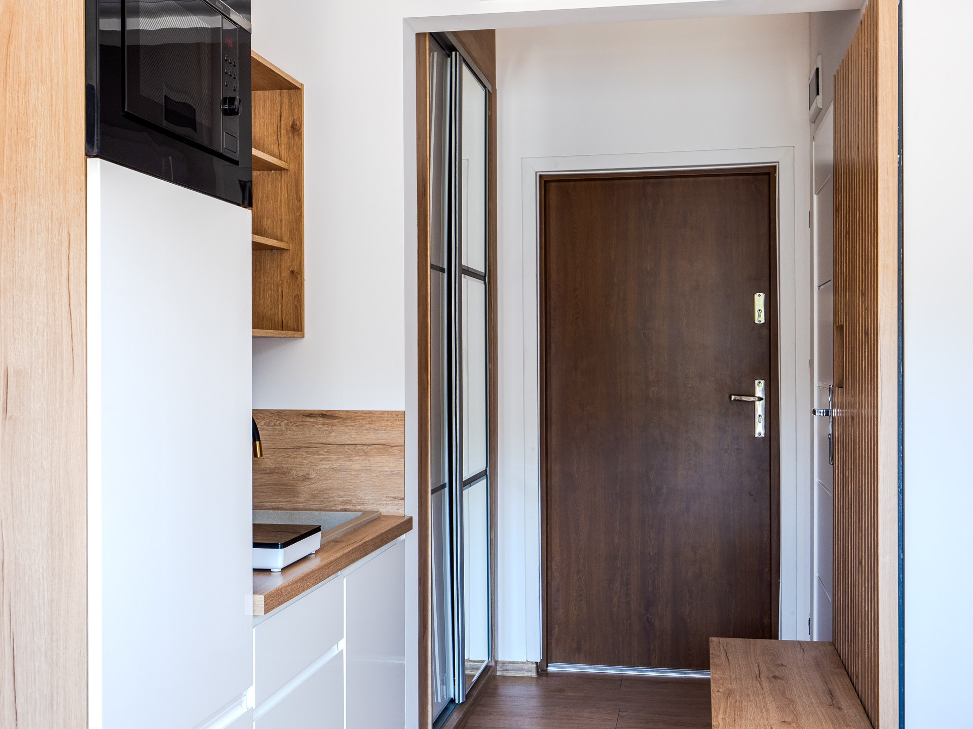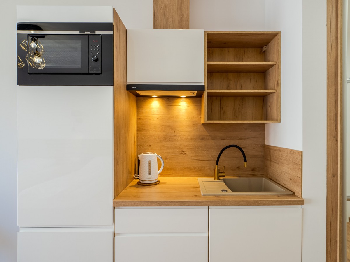 - aneks kuchenny: lodówka, płyta indukcyjna, czajnik bezprzewodowy, komplet zastawy i podstawowych naczyń,