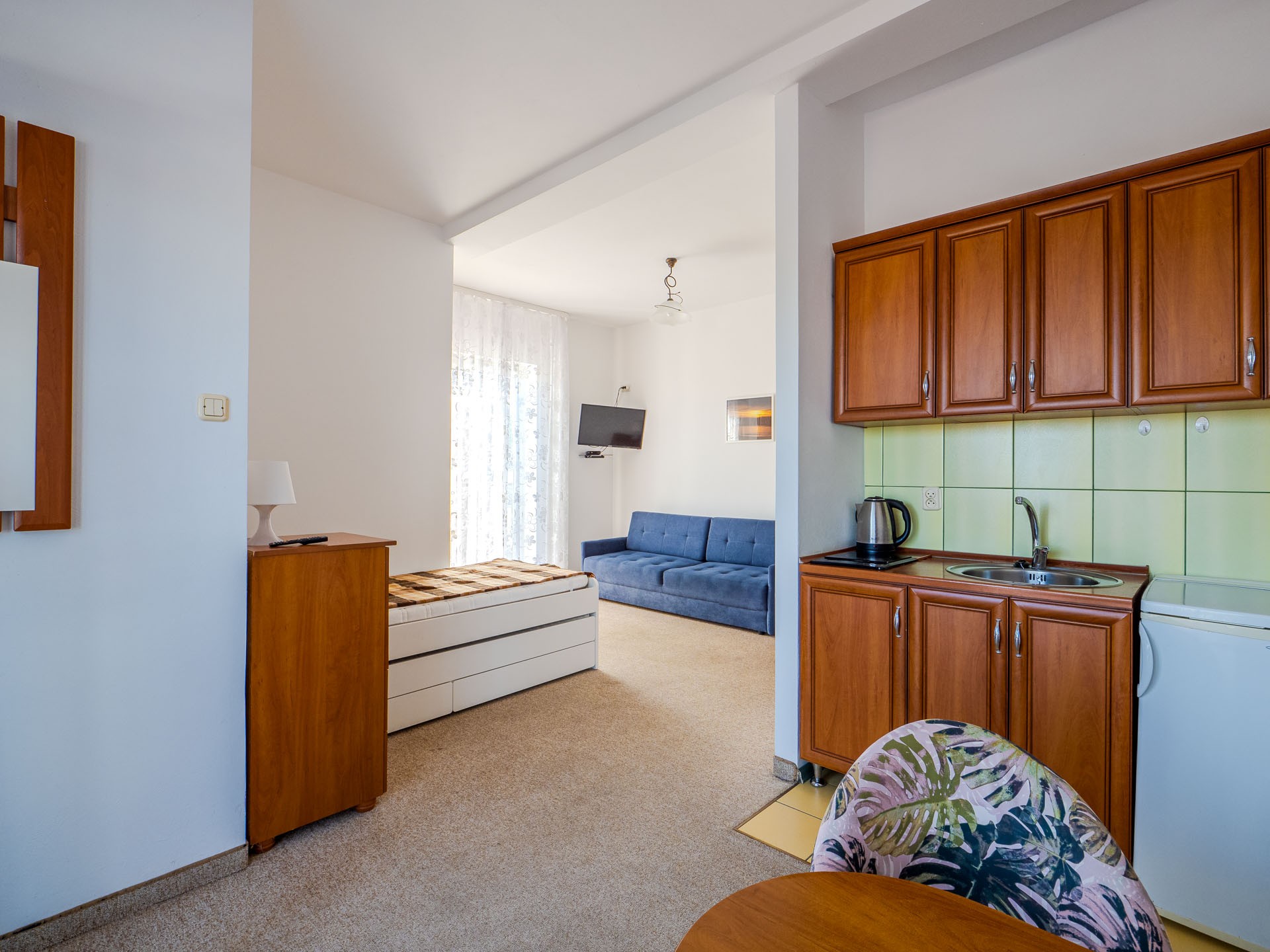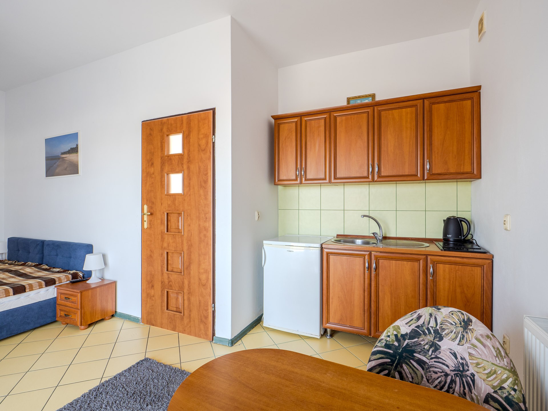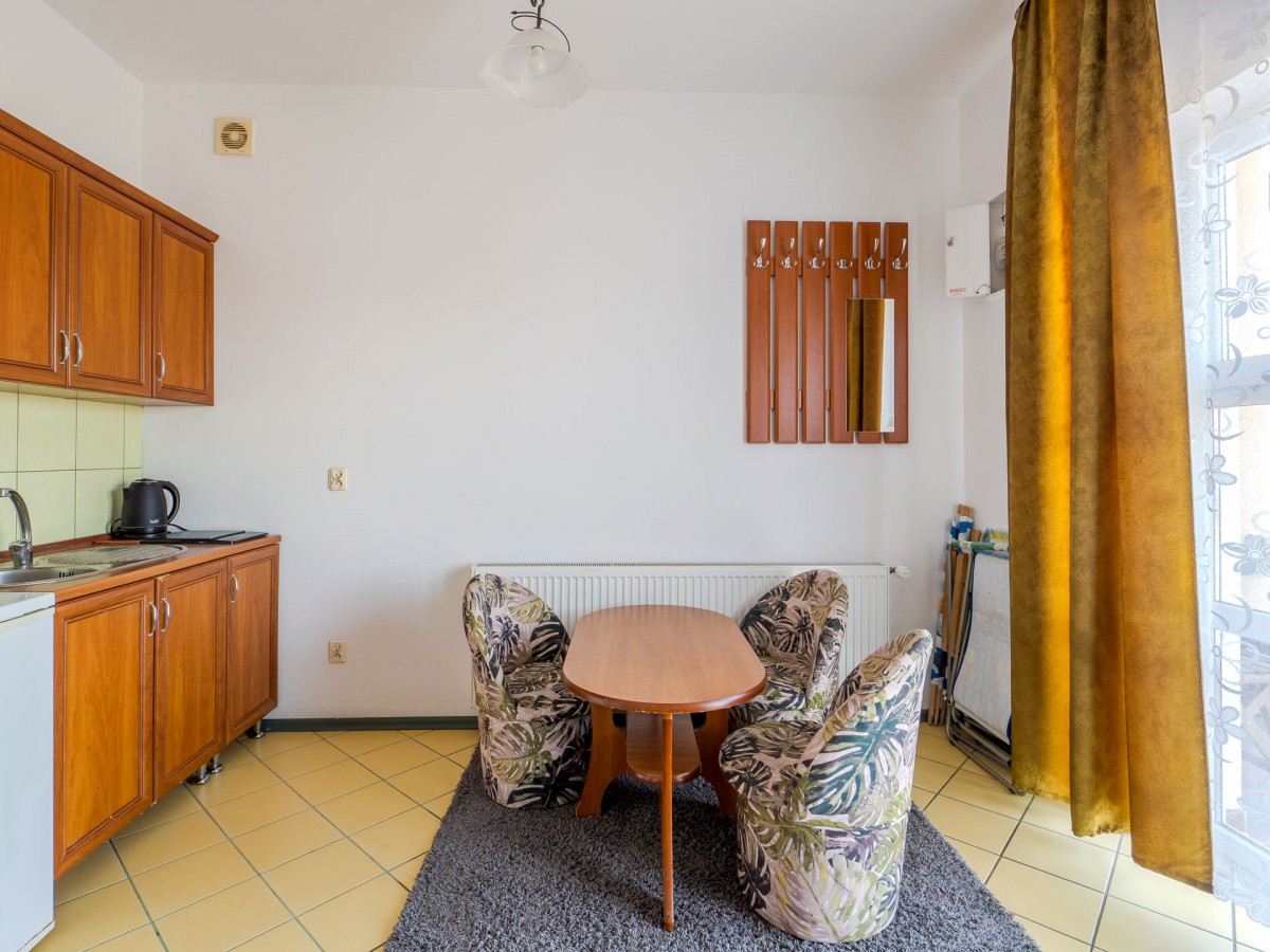 - aneks kuchenny: lodówka, płyta indukcyjna, czajnik bezprzewodowy, komplet zastawy i podstawowych naczyń,