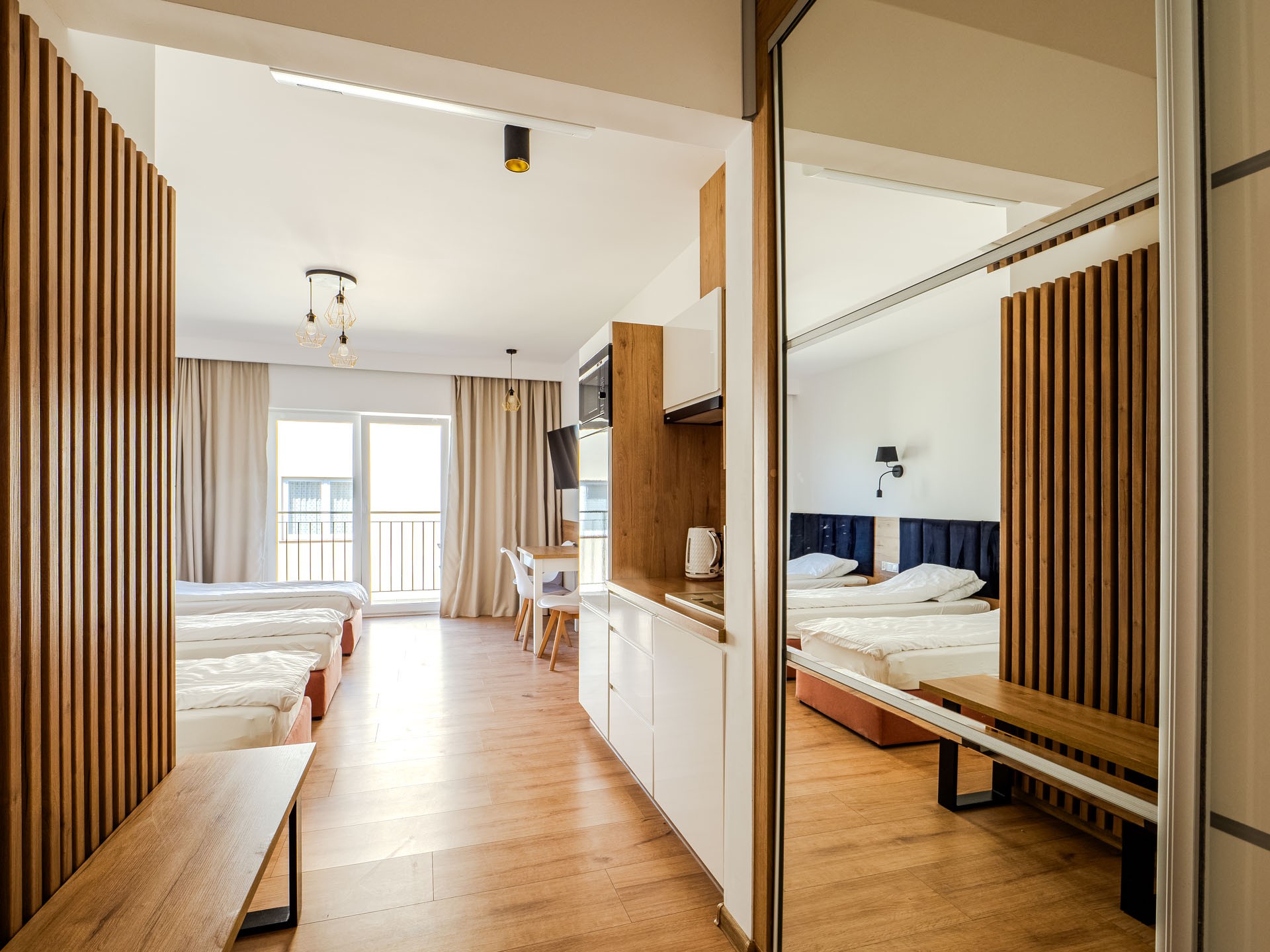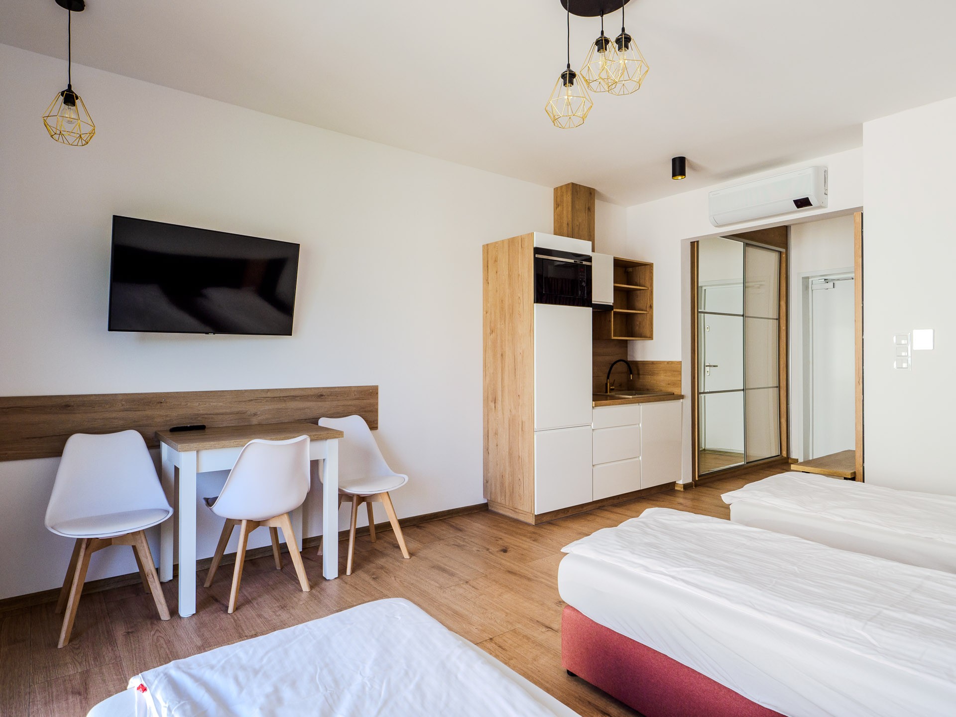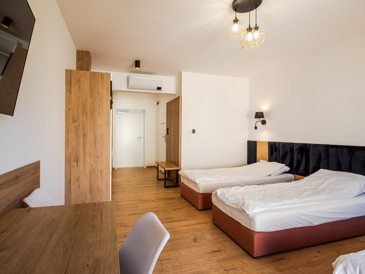 Zapraszamy do skorzystania z wygodnych i funkcjonalnych pokoi, przygotowanych z myślą o różnych potrzebach naszych gości. Oferujemy pokoje dla 2, 3, 4 i 5 osób, a także większe opcje rodzinne. Wśród nich znajdują się dwupoziomowe studia dla pięciu osób oraz praktyczne pokoje dwupokojowe, idealne dla rodzin lub grup. Dostępne są również przestronne pokoje reprezentacyjne, mieszczące do 4 osób.